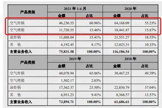 据公开资料显示,比依股份成立于2001年。2003年开始公司开始出口油炸锅,在接下来的十余年内产品销往美国、英国等70余个国家和地区。2015年公司成功研发空气炸锅并对外销售,2018年成功研发空气烤箱并开始销售。目前空气炸锅、空气烤箱依然是比依股份的主营品类,2020年占总营收的70%以上。