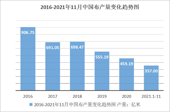 2011年我国布料减产趋势有所缓解,截至去年11月,我国生产布357亿米,同比增长8.5%。