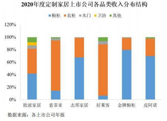 从生产角度来说,为迎合市场消费趋势变化,定制家居品牌商纷纷通过自建或收购的方式发展其他品类,如欧派家居在橱柜和衣柜业务基础上,延伸至木门、卫浴等产品;索菲亚在衣柜基础上,进军橱柜和木门等领域。