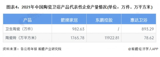 从中 国陶瓷卫浴产品代表性公司的产量情况来看,2021年,箭牌家居和惠达卫浴的卫生陶瓷产量在900-1000万件左右;东鹏控股的陶瓷砖产量超过1亿平米,远高于箭牌家居和惠达卫浴。