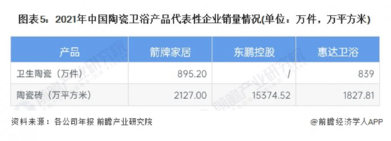 从中 国陶瓷卫浴产品代表性公司的销量情况来看,2021年,箭牌家居和惠达卫浴的卫生陶瓷销量在800-900万件左右;东鹏控股的陶瓷砖产量超过1.5亿平米,远高于箭牌家居和惠达卫浴。