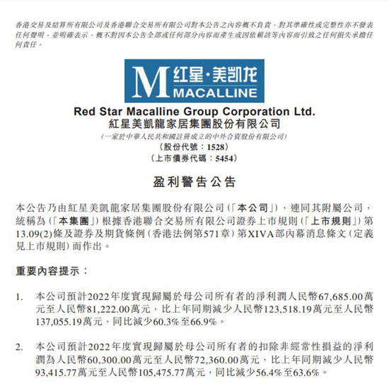 1月30日,红星美凯龙发布盈利警告公告,预计2022年实现归属于母公司所有者的净利润为6.77亿元至8.12亿元,同比减少60.3%至66.9%;预计实现归属于母公司所有者的扣除非经常性损益的净利润6.03亿元至7.24亿元,同比减少56.4%至63.6%。