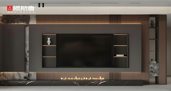 重构空间秩序,本质是对空间利用率与功能性的优化。领航者家居以用户需求为导向,通过整家定制美学将“收纳”与“美学”深度融合。聚焦小户型空间痛点,设计团队善用墙面垂直维度,打造顶天立地式柜体,搭配隐形门设计,让收纳空间隐于无形,既破解杂物堆积难题,又不挤占活动空间;针对大户型,则通过分区定制的柜体与墙面造型划分功能区域——如在客厅打造兼具展示与收纳功能的电视背景墙,在玄关设计集换鞋、挂衣、储物于一体的组合柜,让每个空间各归其位、秩序井然。
