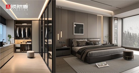整家定制美学的核心,在于打破单品割裂的局限,实现空间的“形、色、质”统一。领航者家居深刻洞察到,家居空间的混乱往往源于风格不兼容、尺寸不匹配。为此,其门墙柜一体化方案从全屋整体规划出发,将房门、背景墙、衣柜、玄关柜等家居单品纳入统一设计体系。无论是极简风的利落线条、轻奢风的精致细节,还是新中式的意境悠远,都能通过统一的材质、色彩与设计语言,让每个空间相互呼应,形成浑然一体的视觉效果,从根源上消解空间的碎片化感。