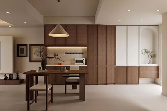 主材质:选浅胡桃木+奶白色哑光板,暖棕木色自带中古的复古温度,奶白哑光板柔化了木质的厚重,两者碰撞出“温柔显贵”的质感;