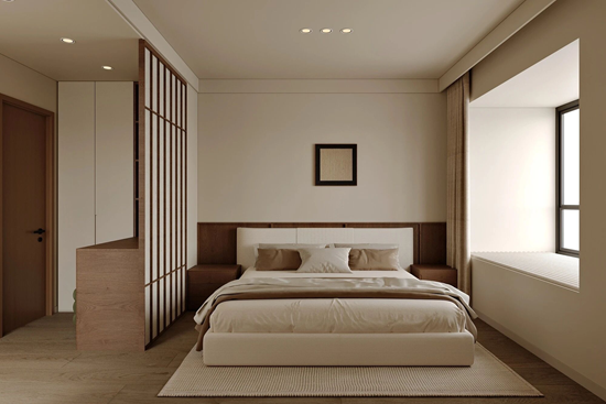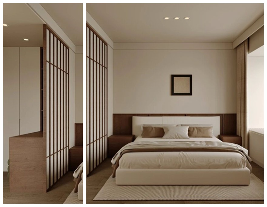 局部点睛:衣柜侧边用木质格栅屏风代替实墙,既做了空间分区,又用中古标志性的格栅元素,把风格“焊”在了细节里。