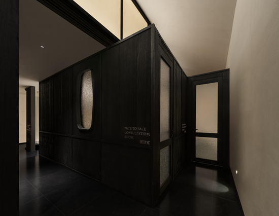 Medical Area: Semi-transparent glass doors allow diffused light to soften the clinical atmosphere, while wooden wainscoting paired with soft wall lamps strikes a balance between professionalism and warmth.